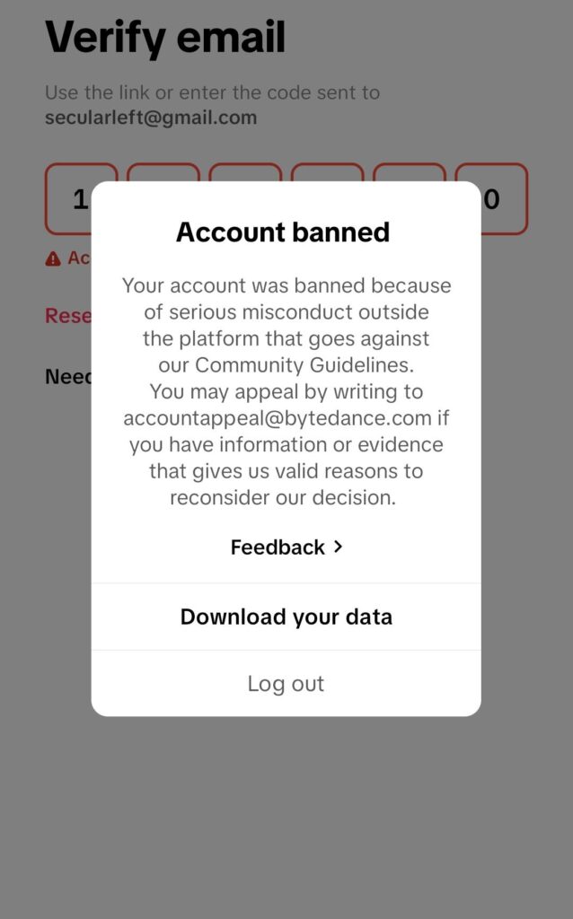 Sometime in early January 2026 Secular Left was banned from the Tiktok platform. No warning was given and no explanation was given either. It may be related to the change in ownership that took place about the same time and other liberal/progressive accounts have reported being banned or having their content hidden. We posted only clips from the episodes to promote the podcast and it is the same content we upload to the other social media platforms with no issues. We have to conclude that the right-wing tech bros are behind protecting President Trump from criticism about the Epstein files and his other fascist actions and is ironic given the right-wing crying about censorship when President Biden just asked social media platforms to do better about keeping misinformation off their services. Tiktok claims a service outage took down some accounts but Secular Left was banned as this screenshot from the app shows.