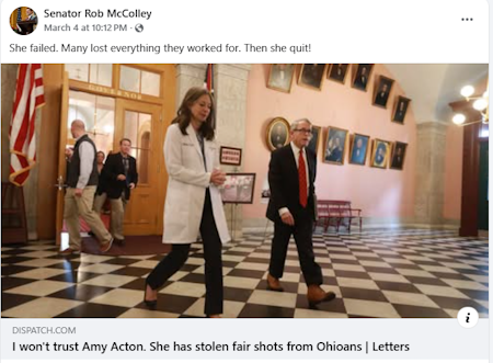 [39:54] This, uh, image on Facebook the other day that caught my eye and he posted on March the 4th and it had, it was a picture of a Columbus dispatch posting and it was a letter to the editor. Somebody had written and it had a picture of Dr. Acton with governor DeWine during the pandemic. And the title of it was, I won’t trust Amy Acton. She has stolen fair shots from Ohioans. Now, it’s a letter to the editor. I don’t know who wrote that letter to the editor because I didn’t look at it. But it was interesting that Senator Rob McCauley posted that. And then he wrote on his blurb, she failed. Many lost everything they worked for. Then she quit.